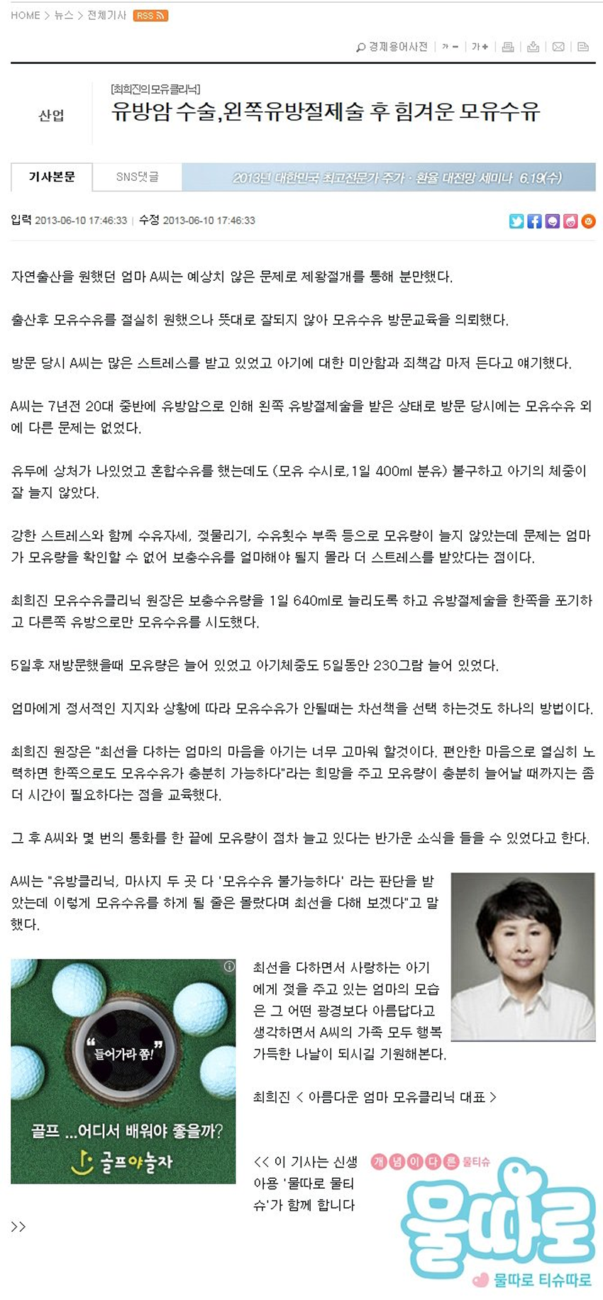 유방암 수술,왼쪽유방절제술 후 힘겨운 모유수유 (한국경제)